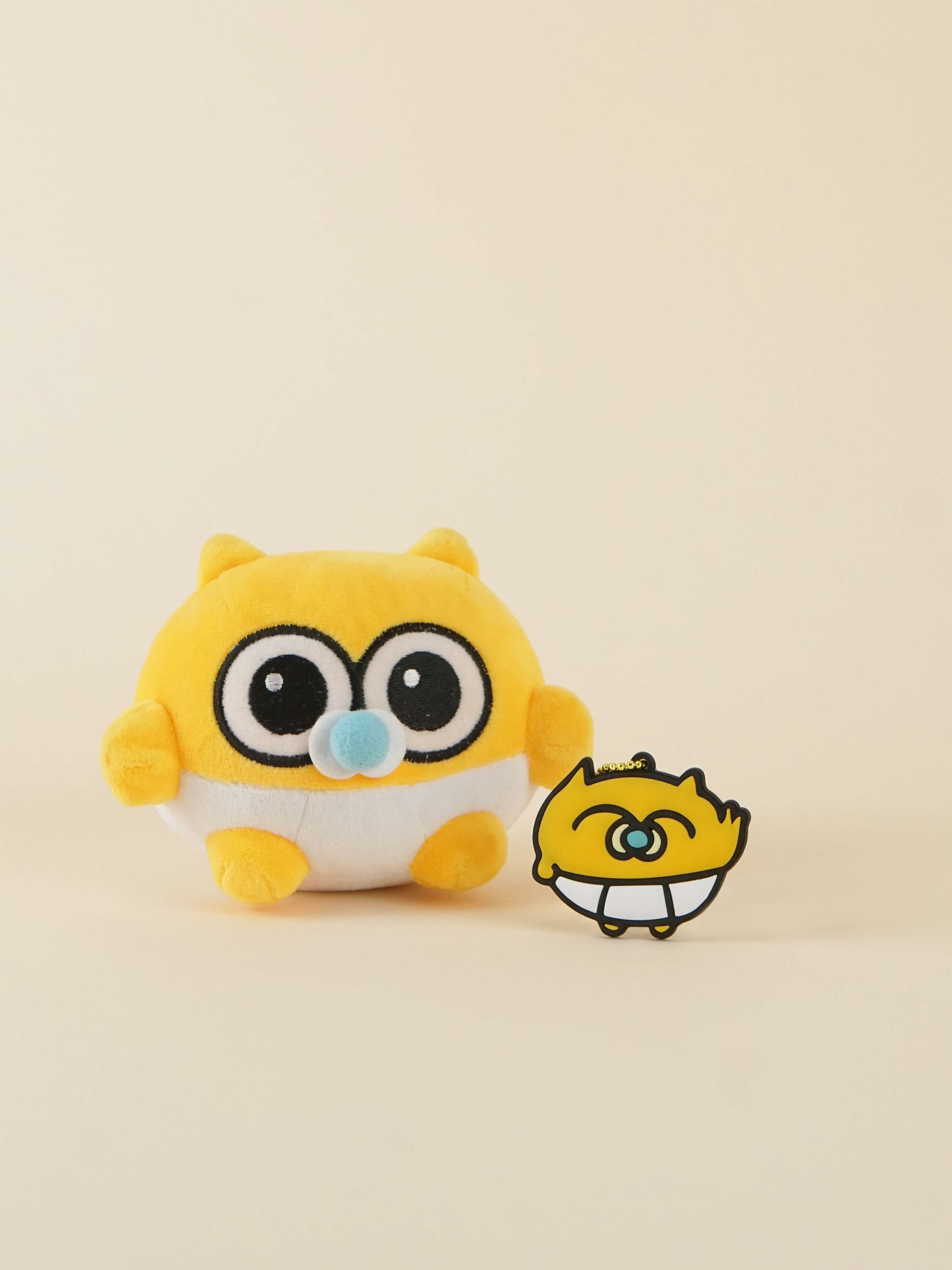 にっこり笑顔でピースするベビのラバーマスコットです。